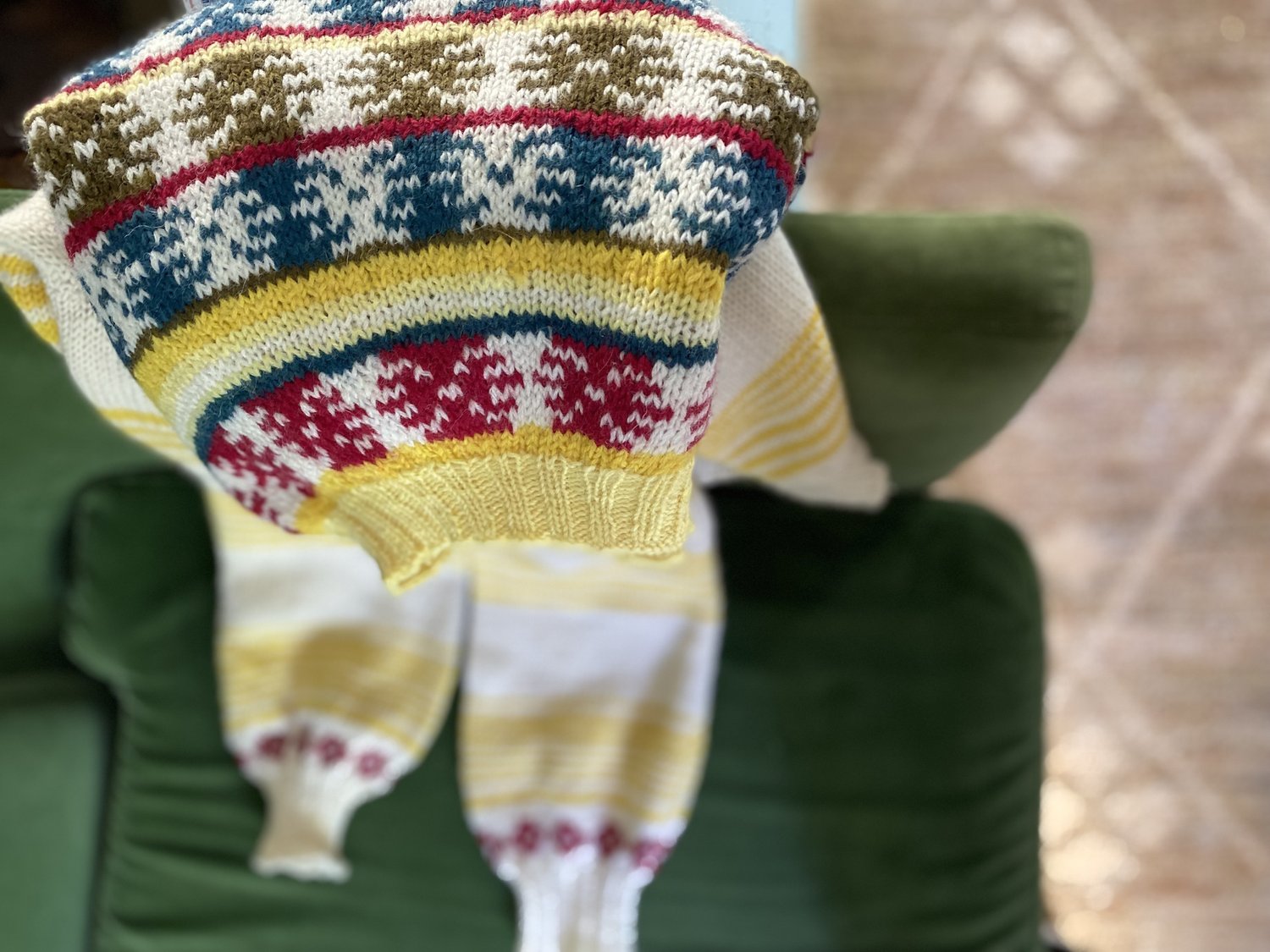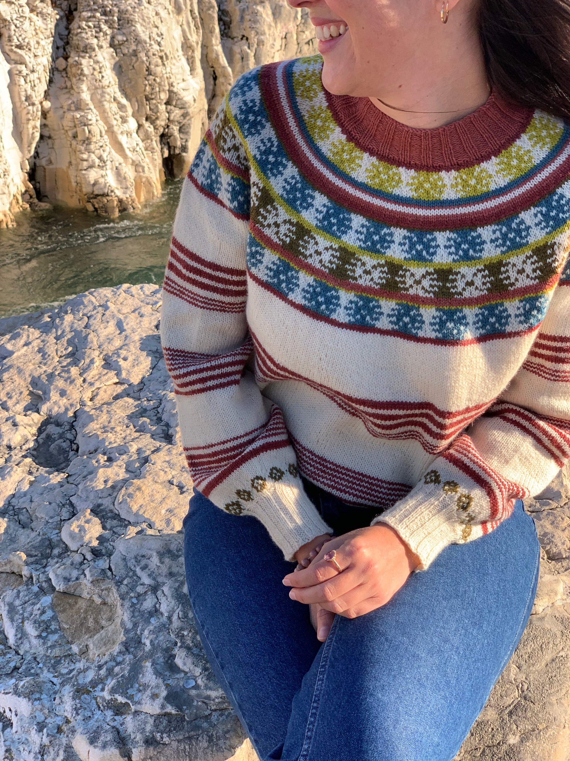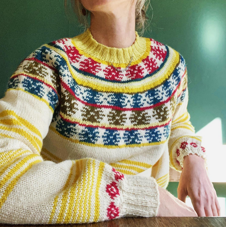 Les rayures irrégulières sur le corps, surmontées des motifs Fair Isle à l’empiècement, donnent à ce pull designé par Sophie Ochera un aspect original et amusant. Avec ses 5 couleurs contrastantes, le choix de combinaisons harmonieuses est infini.
