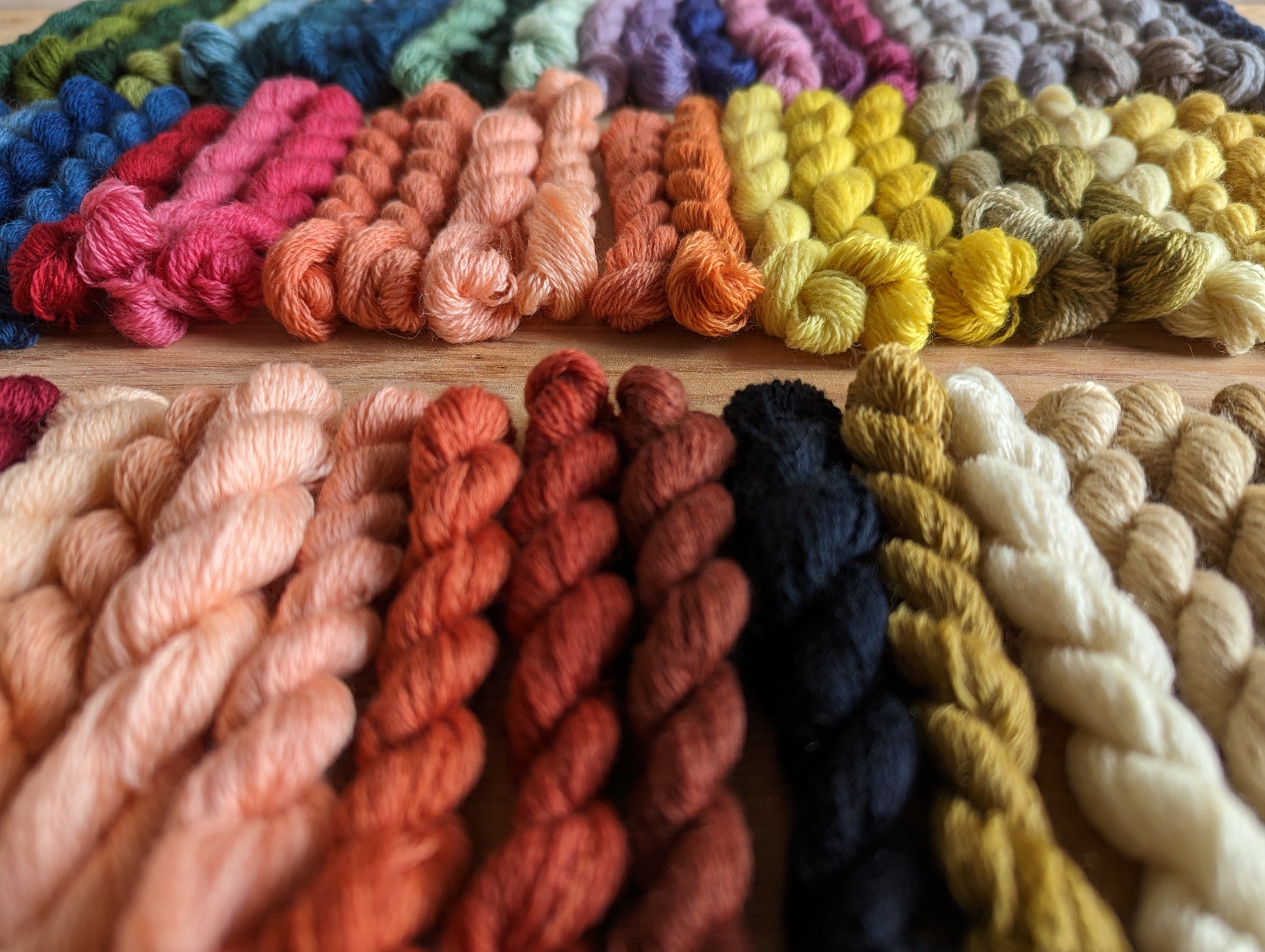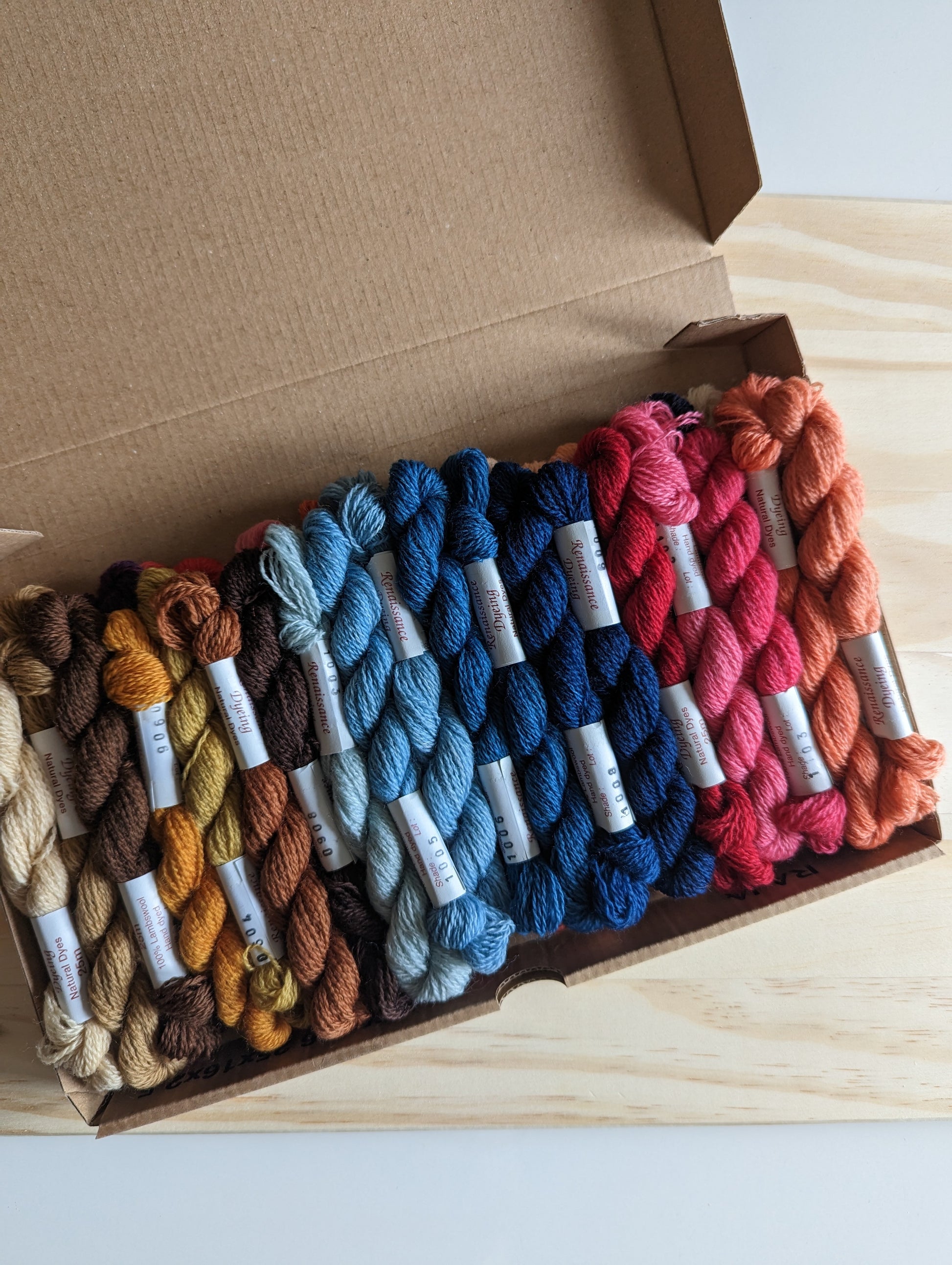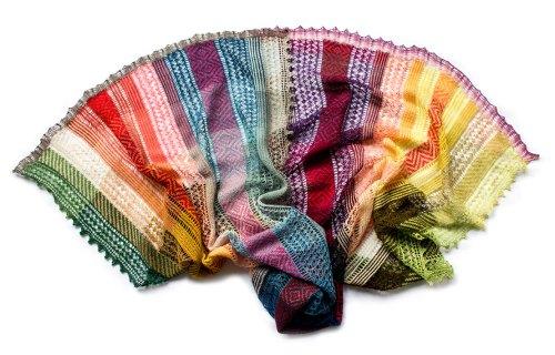 Renaissance Stripes a été conçu par Kieran Foley, de Knit/Lab en utilisant 77 échevettes de Crewel Lace. Soit notre collection complète plus 2 échevettes de rose orangé.